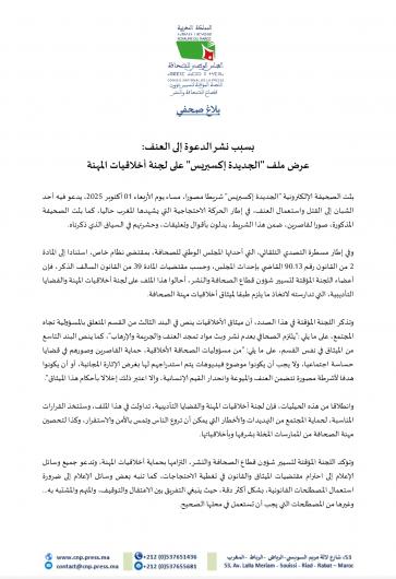 الرباط: أحال أعضاء اللجنة المؤقتة لتسيير شؤون قطاع الصحافة والنشر ملفاً يخص الصحيفة الإلكترونية "الجديدة إكسبريس" على لجنة أخلاقيات المهنة والقضايا التأديبية، وذلك بعد نشرها شريطاً مصوراً تضمن دعوات إلى القتل والعنف، إلى جانب صور لقاصرين أدلوا بتصريحات تم إدراجها في السياق نفسه.