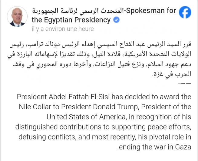 وقالت الرئاسة: “قرر الرئيس عبد الفتاح السيسي منح الرئيس دونالد ترامب، رئيس الولايات المتحدة الأمريكية، قلادة النيل”.